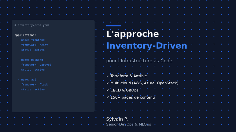 Ce guide complet de 150+ pages vous accompagne dans la mise en œuvre de l'approche inventory-driven pour l'Infrastructure as Code.